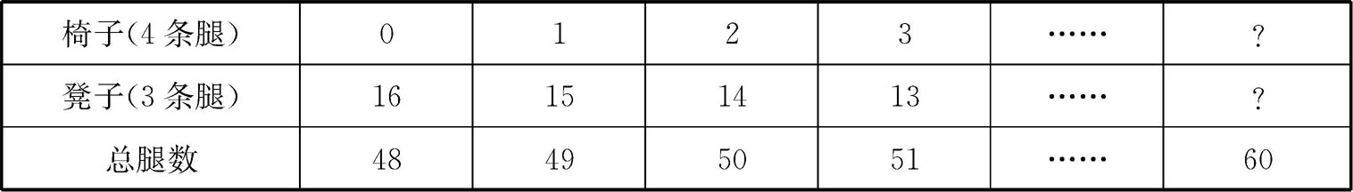 表2-1第一行表达出椅子个数依次递增的有序排列,第二行表示凳子个数依次递减的有序排列,第三行则显现出总腿数“每个数比前一个数多1”的排列规律。