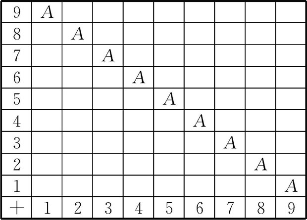 例题2-1所给出情境的特点是多个对象(数字,字母,图形)有序排列,并且按照确定的个数3重复出现,构成循环,学生发现这样的规律后就可以预见后面相应位置的情况了。例题2-2的特点是相加为10的格子涂色后,恰好构成了自左上到右下的“对角线”图案(图2-1中字母A处)。