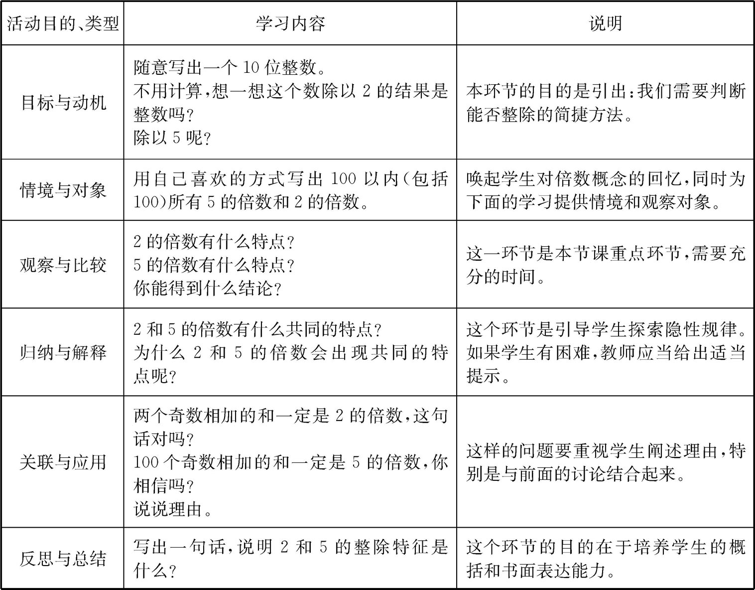 基于以上分析,为了引导学生用“探索规律”的过程学习“数的整除特征”这一内容,可以将“2”和“5”的整除特征放在一起同时学习,为此设计如下的教学方案表2-3。