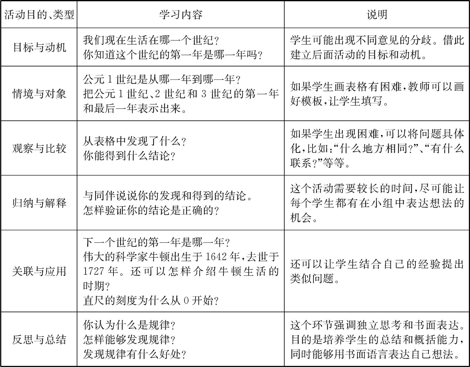 以上学习过程的核心环节是“观察”,观察的重点特别要关注对象之间的关系,这种关系往往体现为“变化过程中的不变因素”。这样的学习活动设计应当说突出了规律的本质。除此之外,学习活动的设计中还应当重视渗透文化和关联思考。比如表2-2中关于牛顿生卒时间的问题以及直尺刻度的问题设计,都是出于这种考虑。