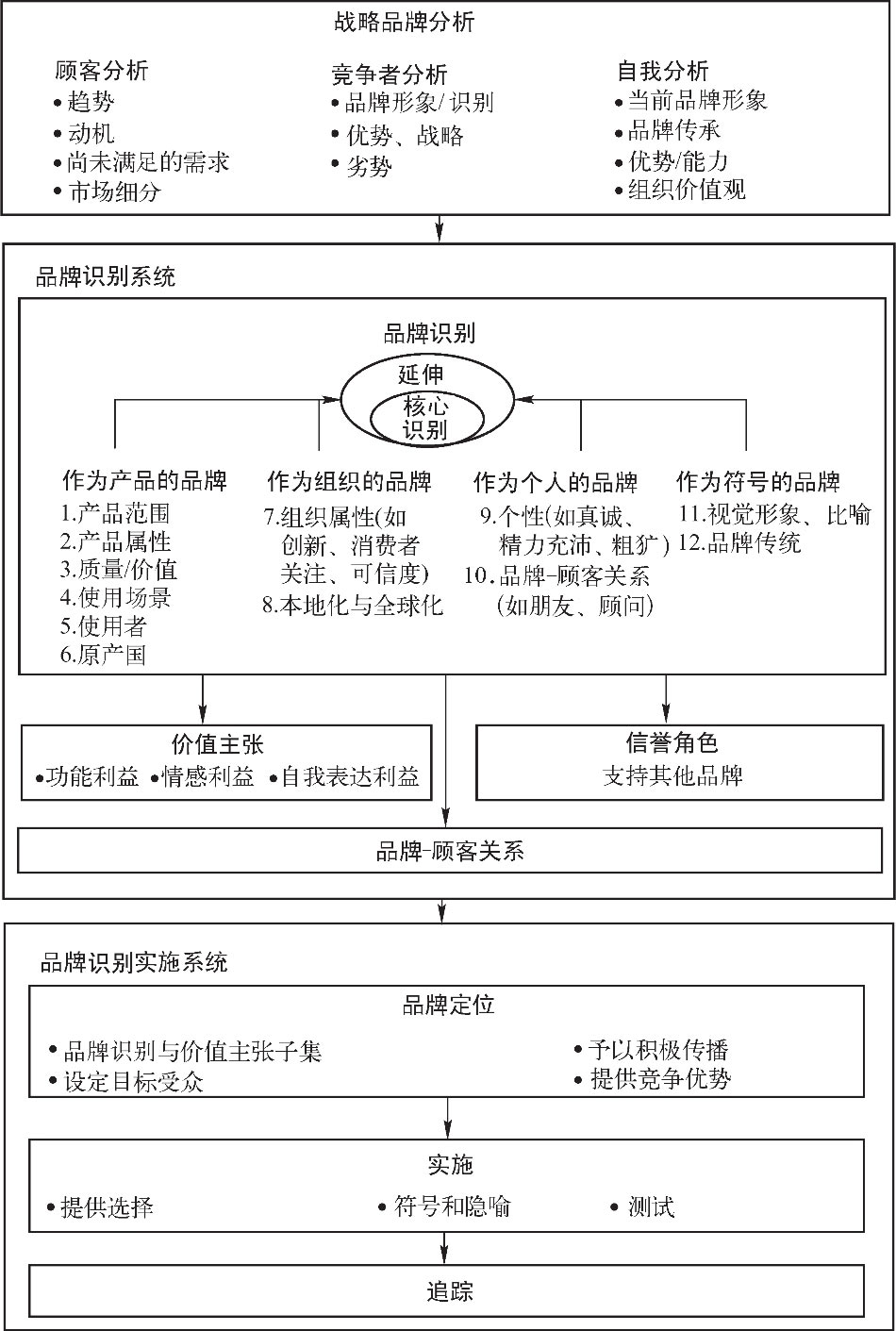图3-3还纳入了另外两个主要内容:战略品牌分析和品牌识别实施系统。这两部分内容将在第6章中详细阐述。实施系统包括品牌定位(从品牌识别和价值主张中提炼的沟通目标)、执行和追踪子系统。战略品牌分析包括对顾客、竞争者和自身的分析,从而为计划模型提供必要的信息来源。
