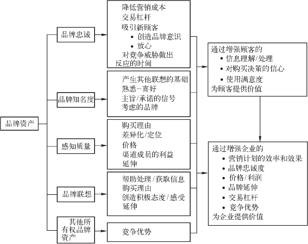 这一定义的诸多方面都需要详细阐释。首先,品牌资产是一系列资产,因此,对品牌资产的管理包括投资创造并强化品牌资产。图1-3的内容在《管理品牌资产》一书中探讨过,该图简洁地概括了品牌资产如何产生价值。(注意,为了保证完整性,图1-3把第五项资产,即其他所有权品牌资产也纳入进来。这类资产是指渠道关系和专利权等附着于品牌的资产。)