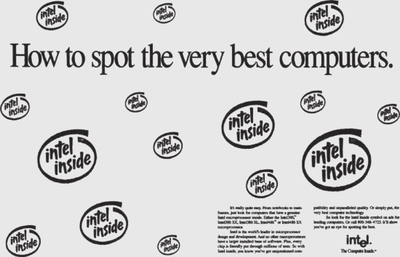 1991年,英特尔做出了反应,鼓励IBM、康柏、捷威和戴尔等电脑公司把“Intel Inside”标志用在其产品广告和包装上。条件是英特尔支付这些公司联合广告费用,费用金额为这些公司售出的包含英特尔产品的3%的销售额(如果这些公司在包装上也使用该标志,则是5%)。Intel Inside广告,如图1-4所示。