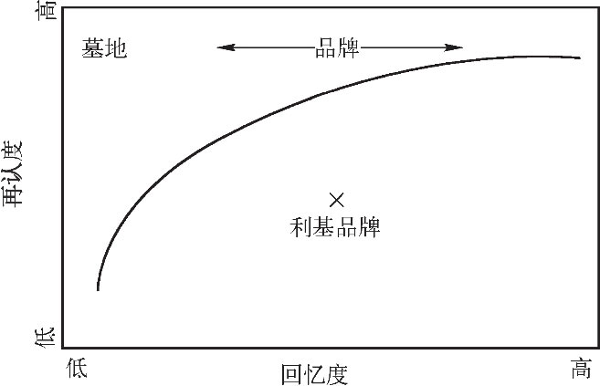 图1-5表明了回忆相对于再认的作用,该图描述的是一个“墓地模型”,是欧洲扬罗必凯广告公司在吉姆·威廉姆斯的指导下开发出来的。在这一模型下,一类产品中的品牌被列在一个表明再认度和回忆度的图上。例如,有20个汽车品牌,每一品牌的再认度和回忆度都可以被测量出来,测量数值为每个品牌在图上做了定位。通过对多类产品的研究表明,品牌倾向于按照图中显示的曲线分布。但存在两种例外情况,它们都反映了回忆的重要性。