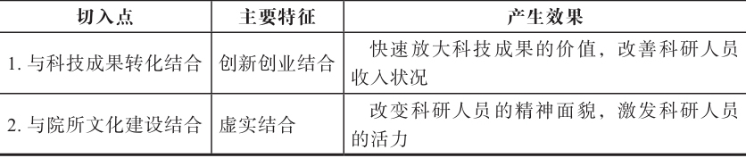 那么,科研院所到底该如何推动内创业呢?主要有两个切入点。一是与科技成果转化结合,即科技成果经由内创业团队引入资金、市场等要素,加速推向市场,让创新和创业真正相互促进。二是与院所文化建设结合,通过内创业激发团队活力,增强科研人员市场意识,唤醒组织内的企业家精神,实现个人价值创造和组织成长的有机结合。具体如表4-2所示。