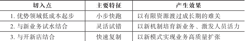 至少有三类切入点可供选择:一是从优势领域低成本起步,对于资源有限、刚起步的中小企业,这样的切入方式可实现内创业快速成长,帮助企业渡过难关。二是与新业务试水结合,这比较适合主业相对稳定、新业务具有潜力的企业。三是与开新店结合,这比较适合模式可复制的服务类企业。具体切入点如表4-3所示。