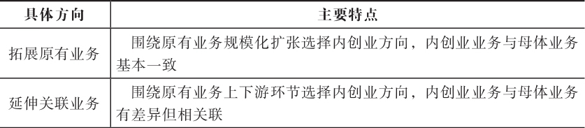 选择与母公司业务协同的创业方向是大多数企业和内创业者的优先考虑。业务相关型内创业的方向选择主要有两类:一是拓展原有业务,实现规模化扩张;二是延伸关联业务,拉长业务链,实现业务升级或深化。具体如表5-2所示。