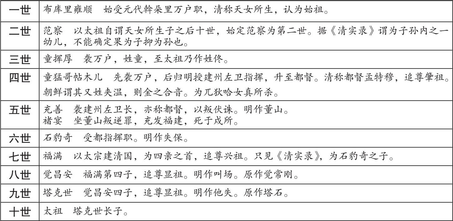 建州女真,既为女真中最优秀之部分,初因居渤海时之建州,谓之建州女真。自元设五万户时,建州之名,必已存在。元亡归附于明,明就其建州部落之名,授以土官卫职,而即名建州卫。先授建州卫职者,为元之胡里改万户阿哈出。由阿哈出复招致斡朵里万户童猛哥帖木儿,授以建州左卫指挥之职。清之初系,为明之建州左卫。始授左卫职之猛哥帖木儿,又因其姑姊妹中,有入明宫为妃嫔者,因内宠之故,至升都督职衔,《清实录》谓之都督孟特穆。乃以布库里雍顺为分族之始祖,孟特穆为肇基王迹之祖。故后开国建号,尊孟特穆为肇祖,以记其得国实由孟特穆承明宠待而来。孟特穆即猛哥帖木儿,而去其童姓不著。孟特穆距布库里雍顺约三四代,太祖责兀喇贝勒布占泰,谓其于己之祖先为天女所生,乃十世以来之事,岂有不知。则太祖为孟特穆六世孙,并其本身为第七世,其前亦不过三世。元享国短,元初授布库里雍顺万户,不及百年,已入于明,其间亦只应有三世时限。孟特穆袭职或已入明初,或尚在元末,俱未可知。而其父名挥厚,亦为万户,见《朝鲜实录》。再上即必有名范察者,当为布库里雍顺之孙。孟特穆尊为肇祖,其子为充善,为褚宴,明作董山、童仓,童为其姓,仓当即褚宴之合音,朝鲜则谓童仓即董山。董山之弟,朝鲜则名“重羊”,或“充也”,或“真羊”,或“秦羊”。充善之子妥罗、妥义谟、锡宝齐篇古,妥罗继充善袭建州左卫职。而锡宝齐篇古,“篇古”二字为职名,或云即“万户”之译音。锡宝齐原作石豹奇,《清实录》谓为充善之第三子,《明实录》为重羊之子,名失保。明人谓清太祖为建州之枝部,《清实录》亦谓兴祖福满系石豹奇之子。唯太祖确为建州左卫酋长,朝鲜明著之。且太祖尝以建州左卫印信文书致朝鲜,其为石豹奇之后,则非世袭左卫都督者。明人谓失保受指挥职,又谓太祖之先,世为都指挥,则其说皆合。兴祖一世,不见于《明实录》,以其时建州方弱,妥罗之后,世奉朝贡,其枝部酋无他事接触中朝,遂不著录。清之尊为兴祖者,在太宗崇德元年,初用帝制,追尊四亲之世;兴祖为太宗高祖,适当四亲之首,故上不及石豹奇,而适以此不见《明实录》之一代,为追尊所亲之始。若肇祖则缘始祖而尊之。以故充善、石豹奇两世,以亲尽而为追尊所不及,入关后因之。但兴祖以下,一世景祖,二世显祖,即太祖之祖若父,在《明实录》亦载其事实。后来兴、景、显三祖以亲尽而祧,太祖则不祧,祧庙中遂永奉肇、兴、景、显四祖。致论清事者疑其世系之不确,则未尝深求其故也。太祖为开创之祖,清世自应不祧。今先将太祖以上世系,表列如下: