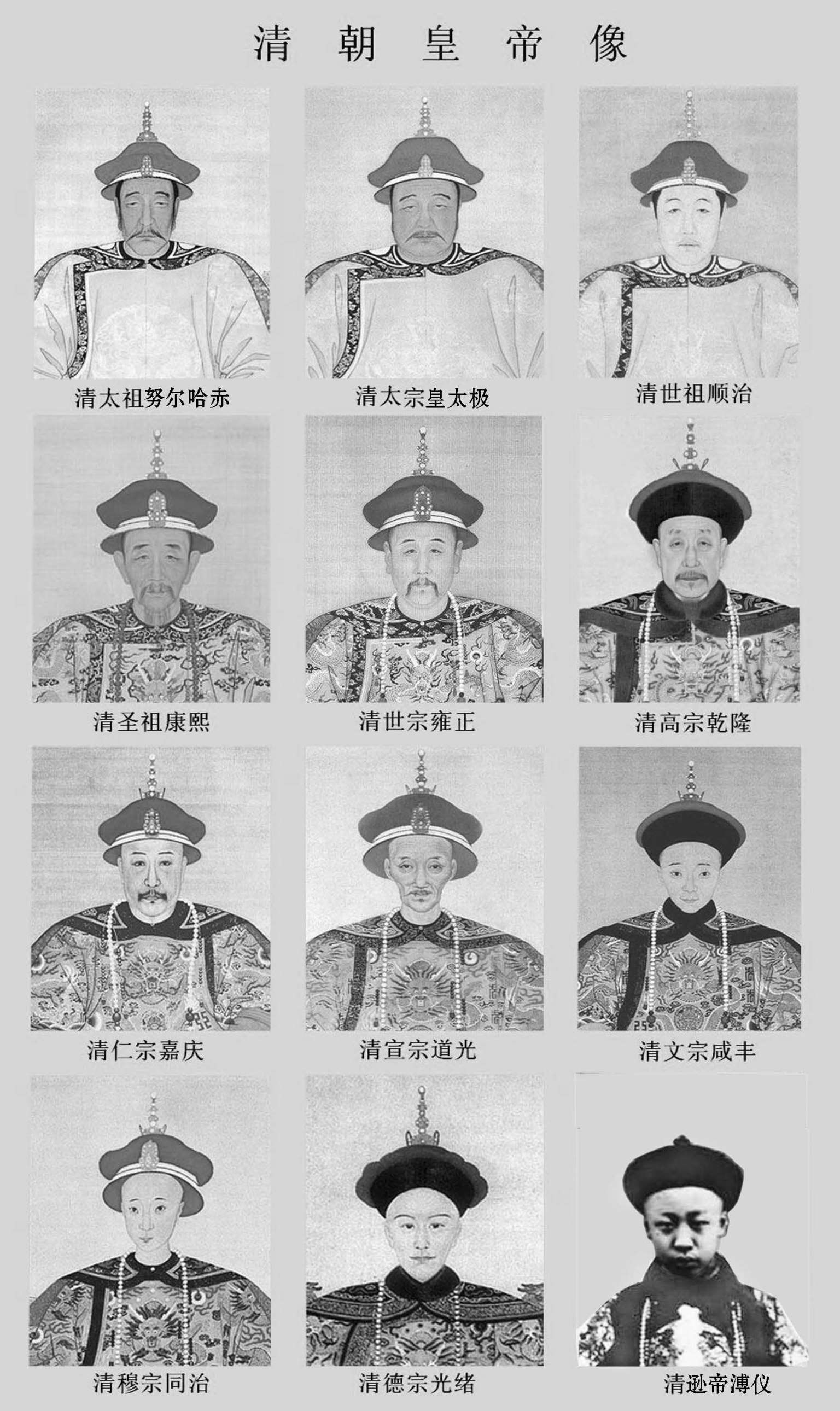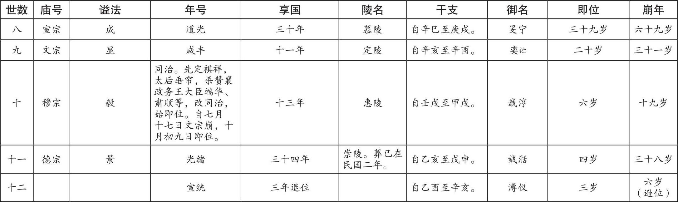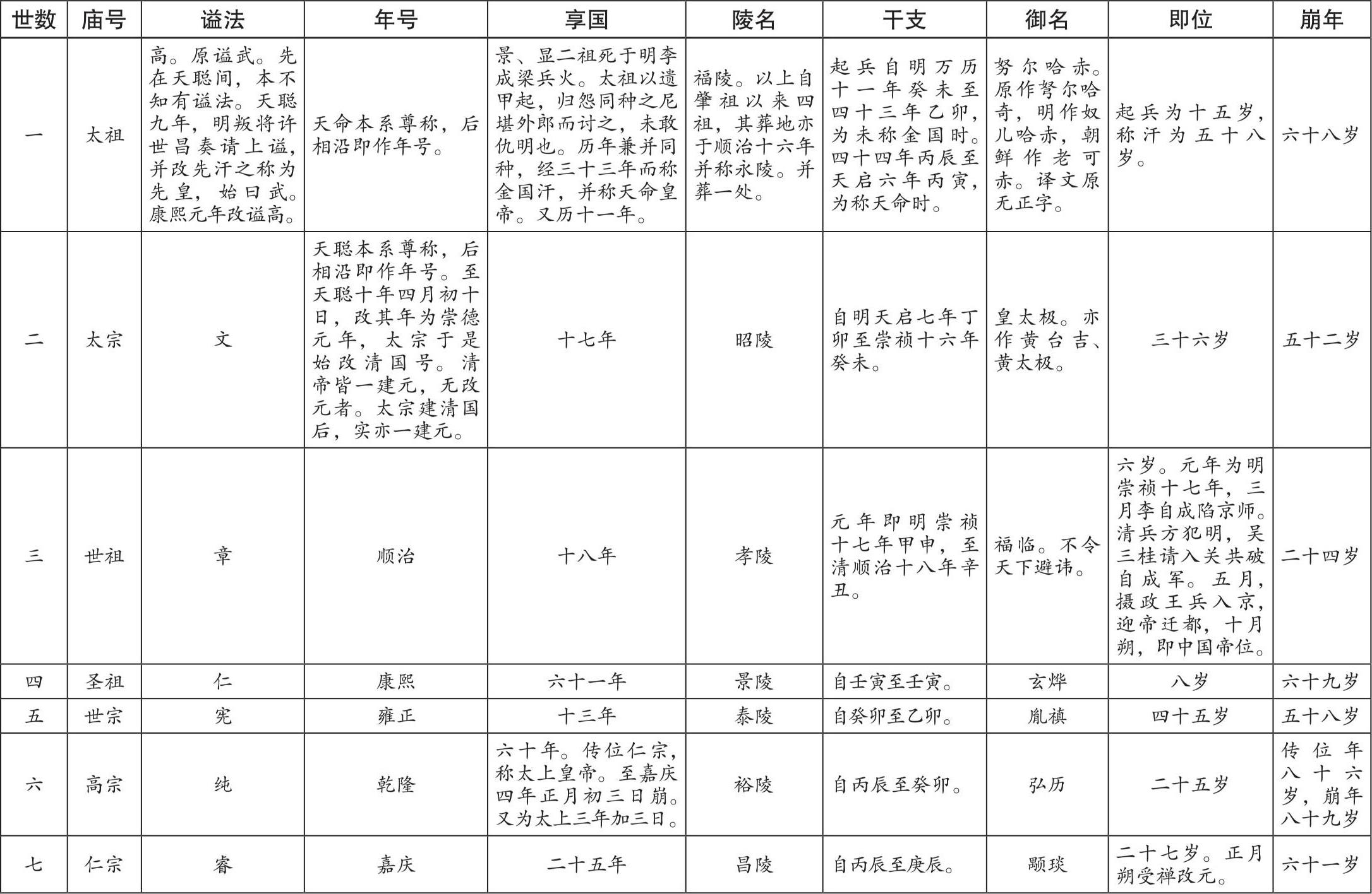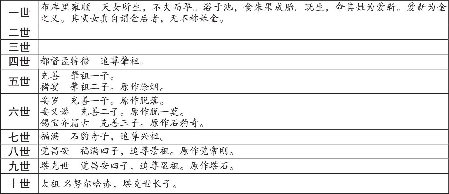 肇祖当元亡以后,臣附于高丽,在高丽王氏朝末,而为李氏朝太祖未篡高丽时之麾下夷将,时当洪武初年。至明收辽东,平海西,声威已至东海之滨,建州女真中,先由阿哈出归附,继招致肇祖并归明。故清之祖先,见之明代及朝鲜纪载者,恰与明开国时相次。明一代二百七十余年,清先世亦附见,未尝间断。前史无论何朝,其开国以前祖先之事实,未有如清之先世,彰彰可考,既详且久者也。充善以叛伏诛。当时之叛,亦并无与明为敌之志,不过桀骜不驯,不守属夷礼节耳,以此诛死。其后驯服无扰,直至太祖,在建号天命之初,对明犹朝贡不辍。太祖身自朝明者三次,皆见《明实录》。明宠以高官,既为都督,又进龙虎将军,则《清实录》亦自载之。而又自谓与明为敌国,自古未尝臣服,则徒自失实,烦史学家为之纠摘,于清实无加损也。太祖之建号天命,本自称为金国汗,而亦用中国名号,自尊为天命皇帝。其实并非年号,并未以天命二字为其国内臣民纪年之用。特帝业由太祖开创,在清史自当尊为开国之帝,入关后相沿以天命为太祖之年号,则亦不足深辩。至太宗改称天聪,亦是自尊为天聪皇帝,非以纪年。观太宗修《太祖实录》,屡称天聪皇帝,为不可分离之名词,可以见之。《太祖实录》成于天聪九年,时虽尚无帝制之心,而已有为国存史之意,亦见志量之不同其他夷酋。《实录》既成,明年又实行建国,去旧国号之金,而定为清。观其以夷称君为满住,后即就改为满洲,以名其国。则清之为清,亦就金之口音而变写汉字,谓为清国耳。而清之一朝,实定名于是。故天聪十年,有大举动,改元崇德,则真用为年号,不自称崇德皇帝矣。国号为清,乃禁人称金;国名为满洲,乃禁人称女真。《清实录》中有“禁人称珠申,务令改称满洲”之文。珠申即女真之对音,亦即肃慎以来之古音也。逮世祖继统,混一中国,天命、天聪,皆成年号。帝统既定,就其开国以后之世系,以一朝定制,表列如下: