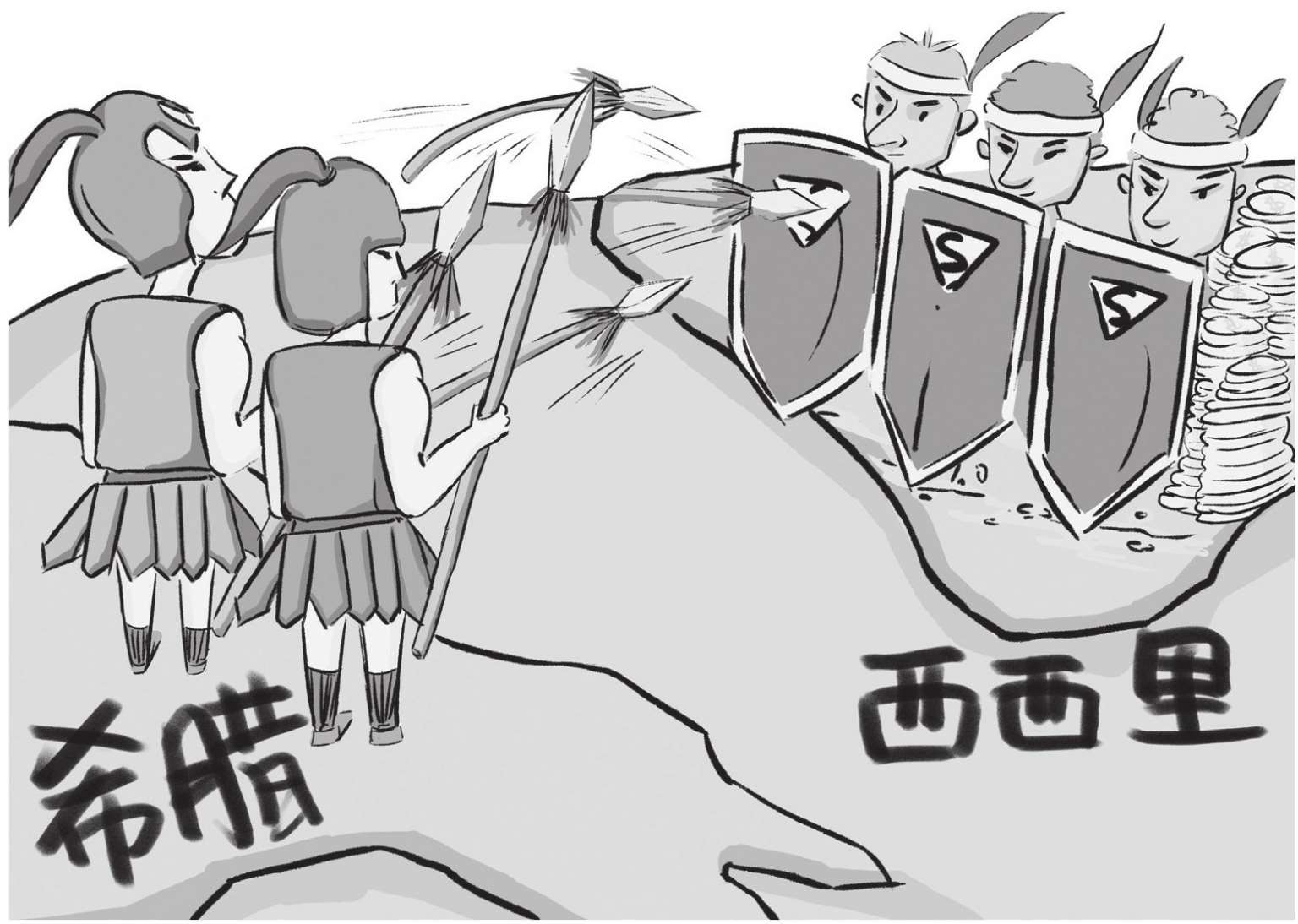 公元前415年,雅典人准备攻击西西里岛,他们以为战争会给他们带来财富和权力,但是他们没有考虑到战争的危险性和西西里人抵抗战争的顽强性。由于求胜心切,战线拉得太长,他们的力量被分散了,再加上西西里人团结一致,他们更难以应付了。雅典的远征导致了自身的覆灭。