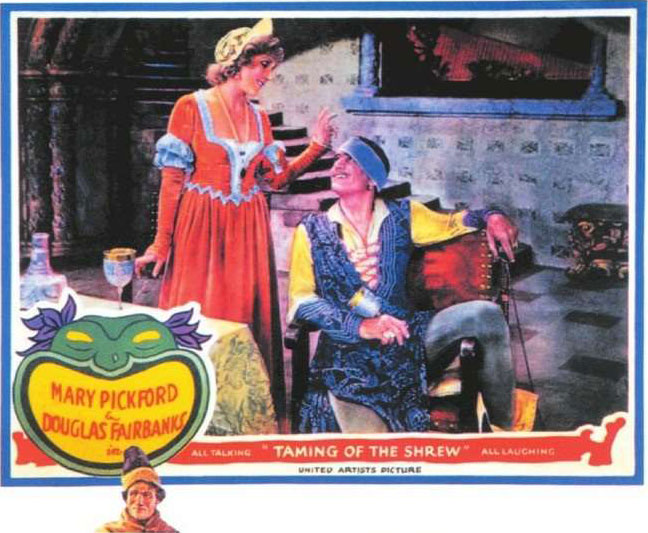 《驯悍记》模仿中世纪意大利喜剧,描写“强悍”的丈夫如何机智地驯服“泼辣”的妻子的过程,体现出夫妻间特殊的“打逗取乐”,带有通俗喜剧的明显痕迹。1929年该剧被搬上银幕,图为《驯悍记》的电影海报。