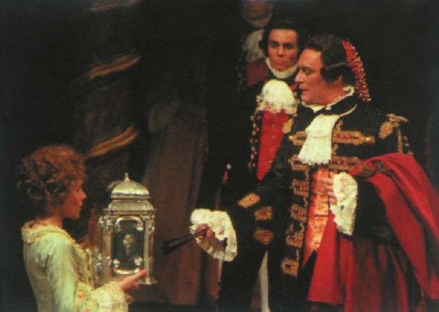 《罗密欧与朱丽叶》是一部激情悲剧,更是受命运捉弄的悲剧,一连串不幸的巧合,致使罗密欧与朱丽叶这对爱侣双双殉情。这部戏剧是莎翁最广为人知的爱情悲剧,数百年来,一直是读者、观众心目中最凄美、最缠绵的经典爱情剧。剧照中反映的情节是:朱丽叶服下神父赠的药假死过去,在她的墓前,未婚夫巴里斯用剑对准了悲痛欲绝的罗密欧。