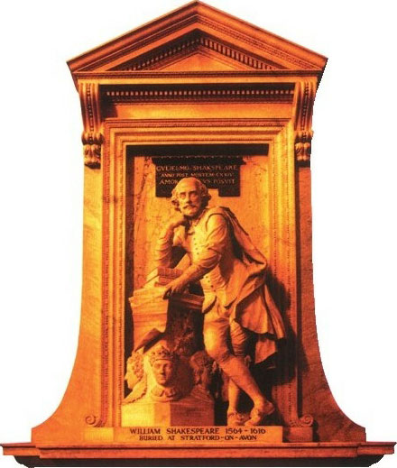 1740年,人们在伦敦威斯敏斯特修道院立起一尊莎士比亚的雕像。这尊雕像凝聚着艺术家和后人对这位伟大作家的敬仰之情。莎士比亚倚着几本巨著,凝神远眺,他左手中的纸上写的是其名作《暴风雨》的一段。而基座上的浮雕正是莎士比亚历史剧中的主要人物——伊丽莎白女王、亨利五世、理查三世等。