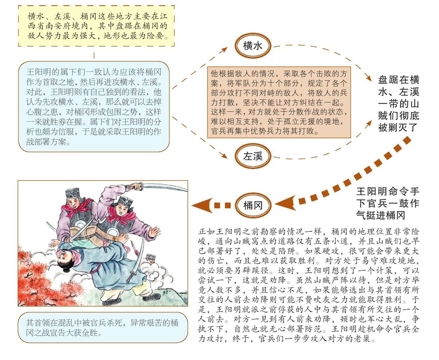 在横水之战进行得异常激烈的时刻,在左溪的战争也已经打响,官兵士气高涨,冲入山贼阵营,对方立即就四散逃窜。战争原本可以早早结束,但是,王阳明想到如果不在对方溃败之时,趁机将其一网打尽,则很有可能留下后患。到时候,再去剿灭对方就要付出更大的代价,因此他就命令士兵追击山贼,不可放过一个。当时,天降滂沱大雨,道路泥泞,兵士们几乎是在泥浆中同这些负隅抵抗的山贼们搏斗。令人振奋的是,盘踞在横水、左溪一带的山贼们很快就被剿灭了,王阳明命令手下官兵一鼓作气挺进桶冈。