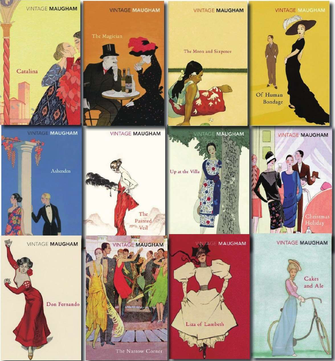 毛姆是一位优秀的多产作家,图为其部分作品的封面,依次为:《卡特琳娜》《魔术师》《月亮与六便士》《人性的枷锁》《阿申登故事集》《面纱》《佛罗伦萨月光下》《圣诞假期》《堂·弗尔南多》《偏僻的角落》《兰贝斯的丽莎》《寻欢作乐》。