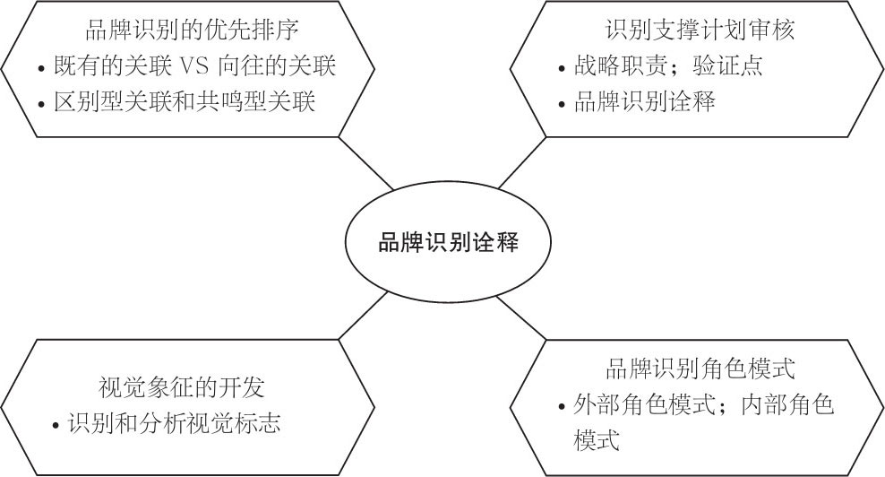 图3-2概括了四种方法。识别支撑计划审核回顾了品牌识别理念背后的物质基础,品牌识别角色模式说明了品牌传播的行为和方案,视觉象征的开发使得识别更加鲜活,品牌识别的优先排序决定哪个维度是品牌定位和创建工作的焦点。