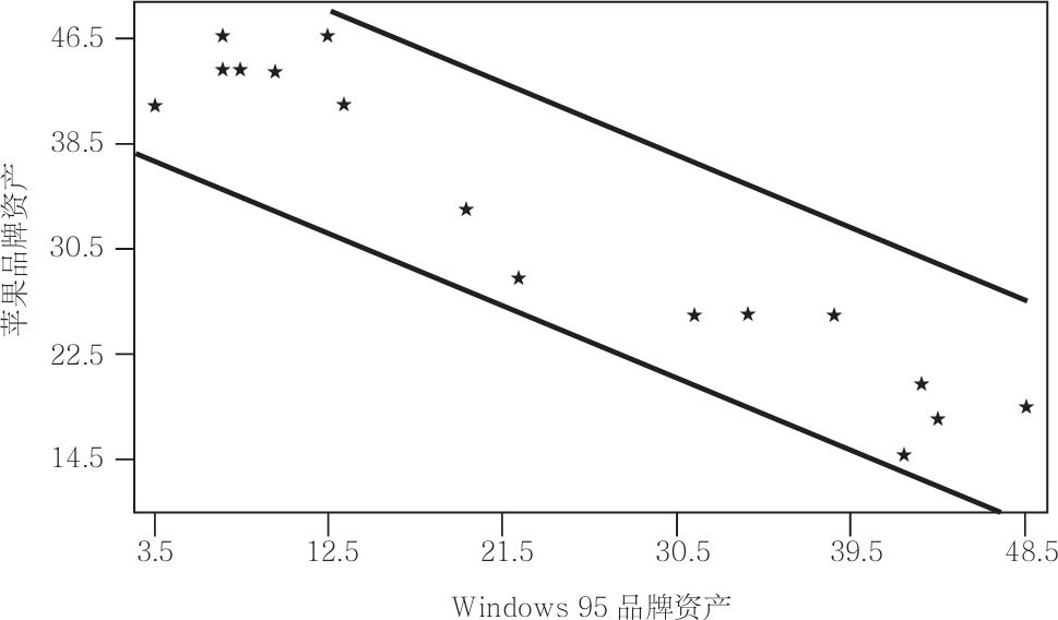 ·竞争对手行为。惠普的品牌资产曾经历了急剧下跌,这在一定程度上就是受到了其竞争对手佳能猛烈广告攻势的影响。Windows 95对苹果品牌资产的影响也是十分巨大的(见图1-4),Windows 95品牌资产的提升以及它对苹果的用户友好界面的压制,都是该影响的体现。事实上,这一结果正是微软所要达到的战略和战术目标。