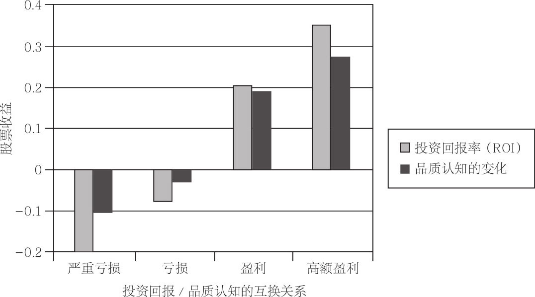 研究发现,投资回报率和股票收益之间存在密切关联,这一发现与金融领域大量实证研究的结果是一致的。更值得注意的是,品牌资产和股票收益之间的关系也非常显著。图1-3说明了品牌资产和投资回报之间的关系。在品牌资产上收益最丰厚的公司拥有30%的平均股票收益率;而与此相反,在品牌资产上损失最惨重的公司拥有的平均股票收益率为-10%。另外,品牌资产的影响不同于投资回报的影响——两者的相关度较小。除了涵盖在品牌资产中的广告投入以外,广告对股票收益几乎不产生影响。