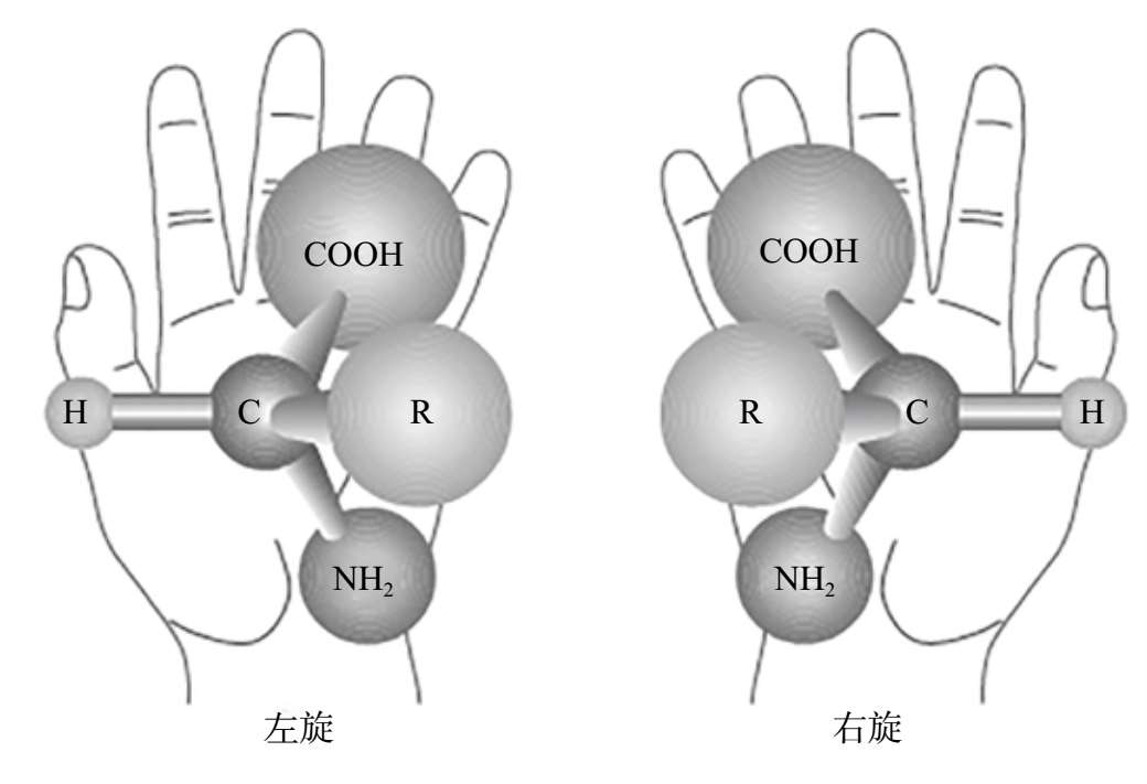 生命系统中的许多分子都是手性分子,这意味着该分子的镜像与原物质不重合。我们的双手就体现了这样的特征,我们的左手是右手的镜像,但是左手和右手的形状不能直接重合(见图1)。所以我们就用“手性”一词来描述分子这样的特质,并且通过不同的分类方式,我们可以区别手性分子的两种不同形式。D—L命名法(D, L classification)是一种比较早期但在生物学领域沿用至今的分类方法,这种方法以分子与有机物质甘油醛的空间关系为标准,将手性分子标记为D(dextro的缩写,又可称为右旋),而它的镜像则被标记为L(levo的缩写,又可称为左旋)。值得注意的是,D和L两个手性分子的物理化学性质是一样的(虽然偶尔有一些例外的情况,但这些情况现在不在我们的考虑范围之内)。这也意味着在任意一个环境中,两种手性分子的数量也应该是一样的。因为,如果一开始有一定数量的手性物质,该物质仅由单一的手性分子比如说D构成,那么根据热力学第二定律,只要有充分的时间,这个由单一手性构成的物质将成为外消旋体(racemic),这意味着这个物质将具有相同数量的D和L两种形式的分子(这一现象是由D和L两种形式之间的缓慢相互转换而造成的)。简单来说,外消旋体比简单的手性分子形式更加稳定——它更加无序,而只要有充分的时间,物质便会朝着这种更无序的状态发展。