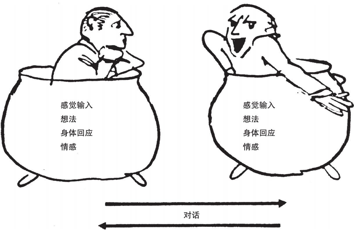 与此同时,我也经历了同样的过程。对于你的样子、声音,你给我的感觉,我也会形成自己的看法,我会联想起自己以往的经验,也会有自己的价值判断和期望,我的身体也会相应地做出反应。你不会真正明白我的感觉,也无法体会我现在的感受,你不了解我的过去,不清楚我的价值观,也不能完全弄明白我身体的真实反应。你只能猜测和想象,我对你也是一样。除非这些猜测和想象得到证实,否则它们就会使人与人之间产生误解,使双方都掉入陷阱。