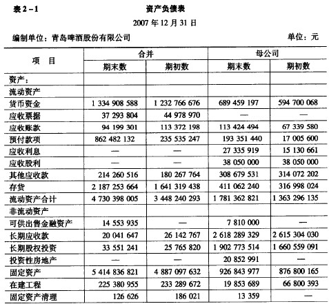 通过对资产负债表基本原理的大致了解之后,我们再来看看这方面的实例——青岛啤酒股份有限公司的资产负债表。