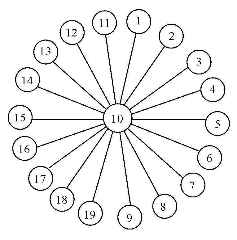 注意,1+19=20,2+18=20,3+17=20,依此类推,将20的两个被加数填在相对的圆圈中,而数字10填在中心的圆圈中。填法如图1所示。