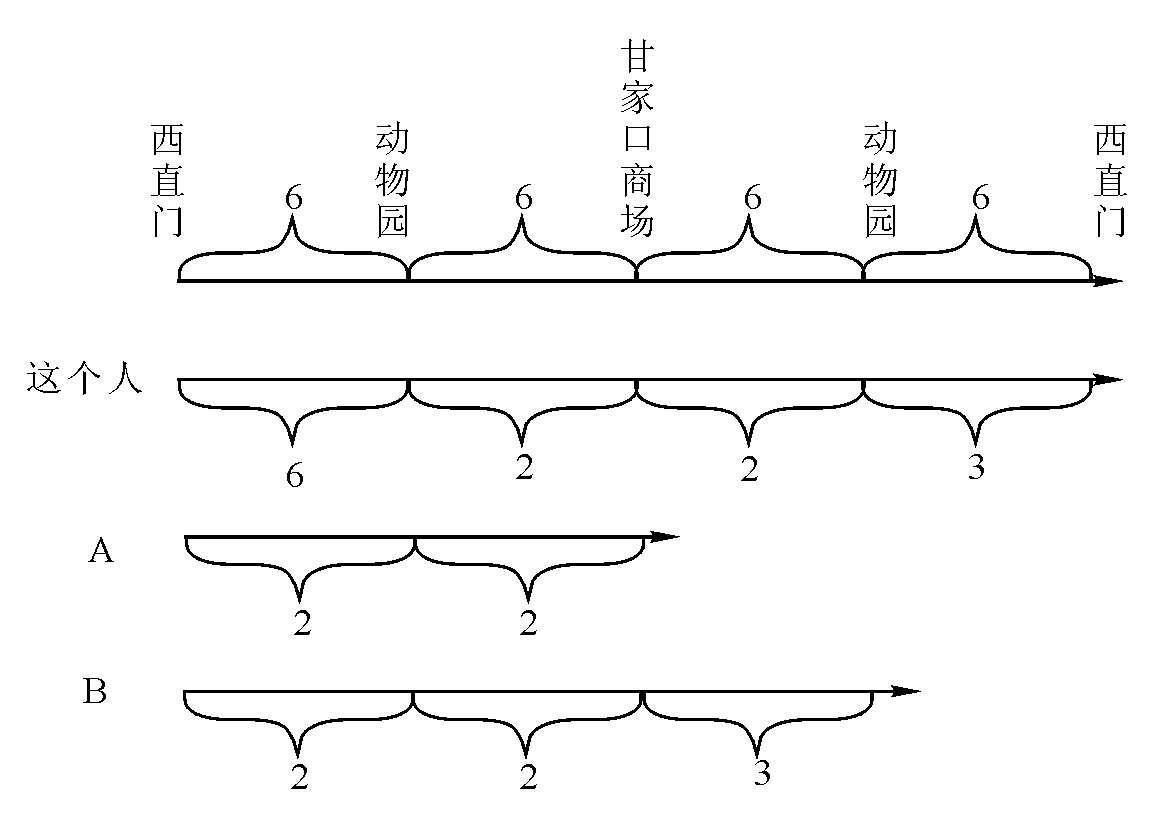这个人付13元,A付4元,B付7元。全部的24元若按照图2所示的由西直门到动物园之间与动物园至甘家口商场之间的分法,便很容易明了。
