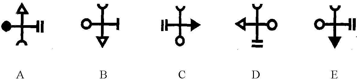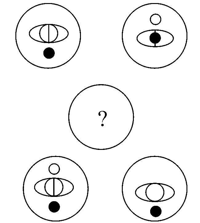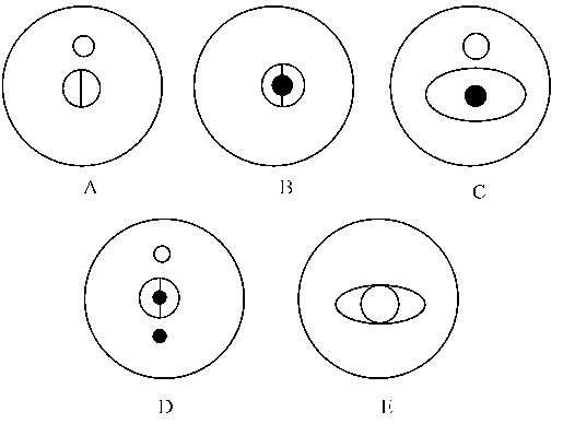 将以下图形(图2-30)外面四个圆中出现的线条和符号根据以下规则转移到中间圆中:
