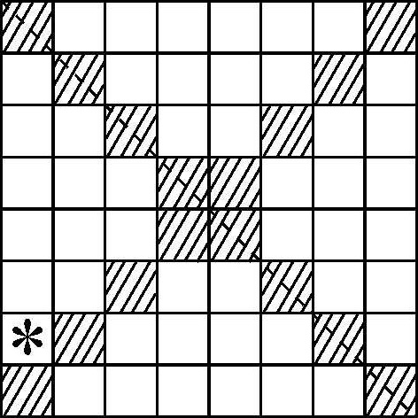 图2-5上由白方块组成4个形状、大小一样的图形。现在要求在每个图形上各放2颗星。但不准2颗星(8颗星中的)处在同一横行或直行上,也不准在同一条对角线上,现在在其中的一块白方格内已放了1颗星,那么剩余的7颗星怎么放置?