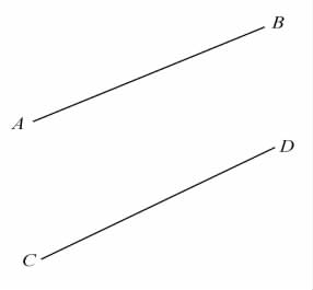 AB和CD是两条平行线段(图2-23),但有人表示,他只要画上3条线就能让它们不平行。在不能变动AB、CD的情况下,这个人会怎么做呢?