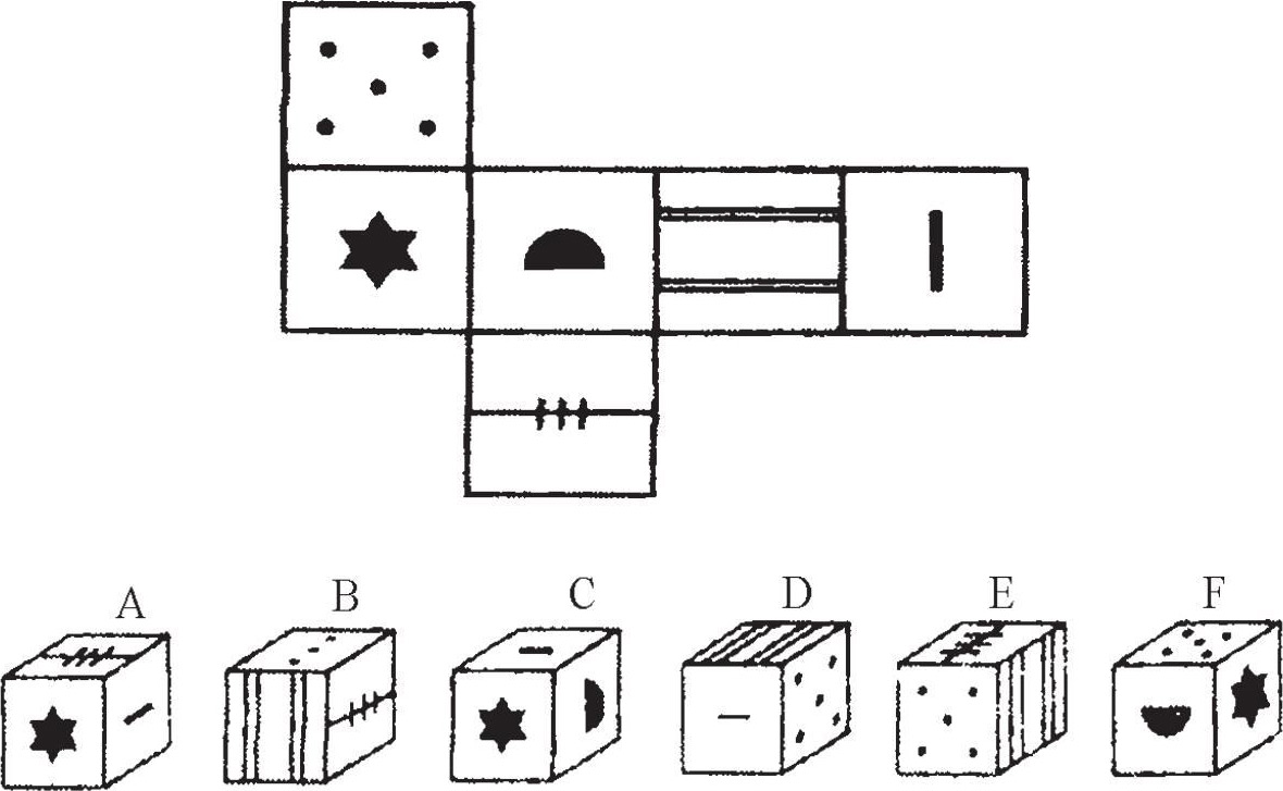 左面的图形(图2-32)可以折成一个立方体,右面立方体中只有一个是正确的,哪一个是正确的?