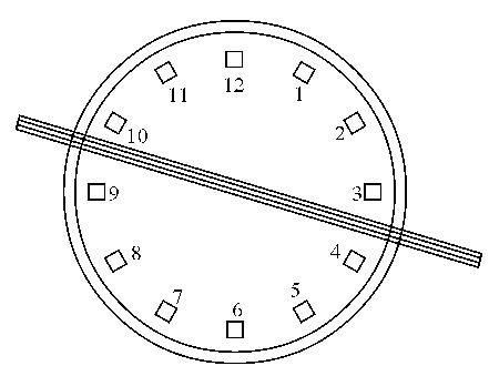 如果要用一条直线,将时钟的钟面分成两半,让这两半的数字各自相加起来的总和相等,我们可以把这条直线像上图(图2-25)这样画。