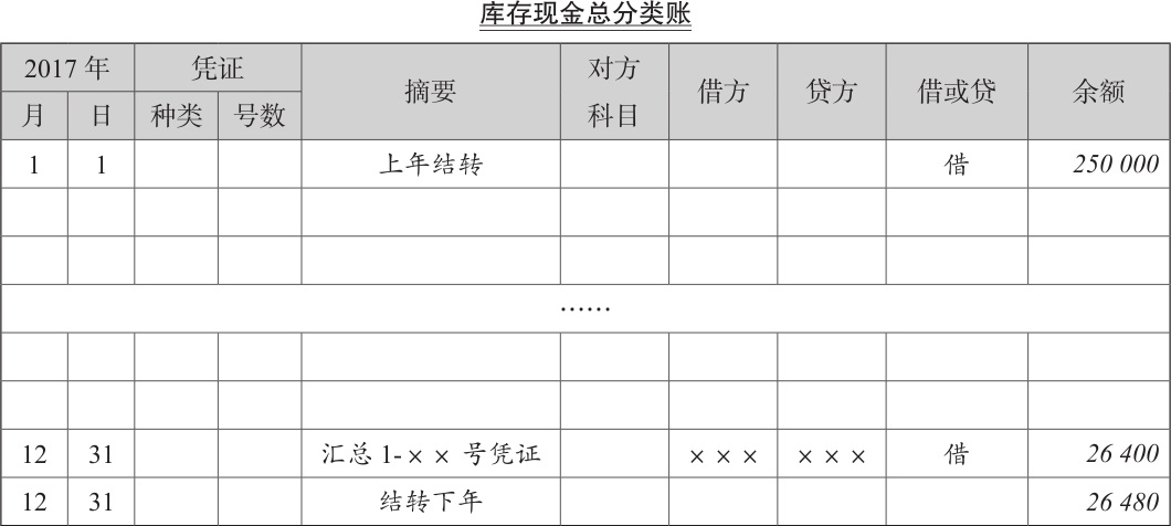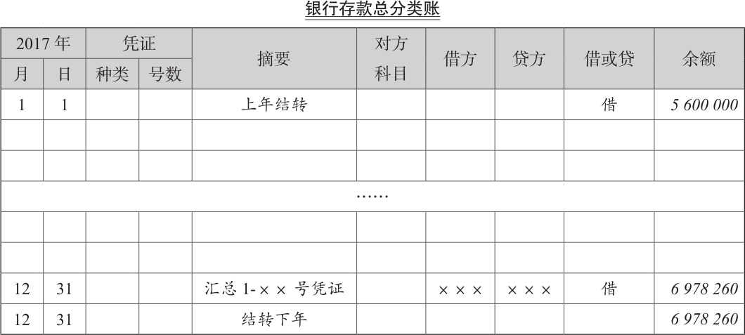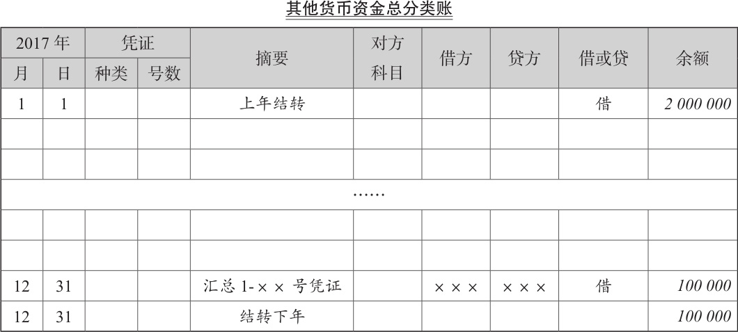 “库存现金”“银行存款”“其他货币资金”的总分类账如表2-4至表2-6所示。