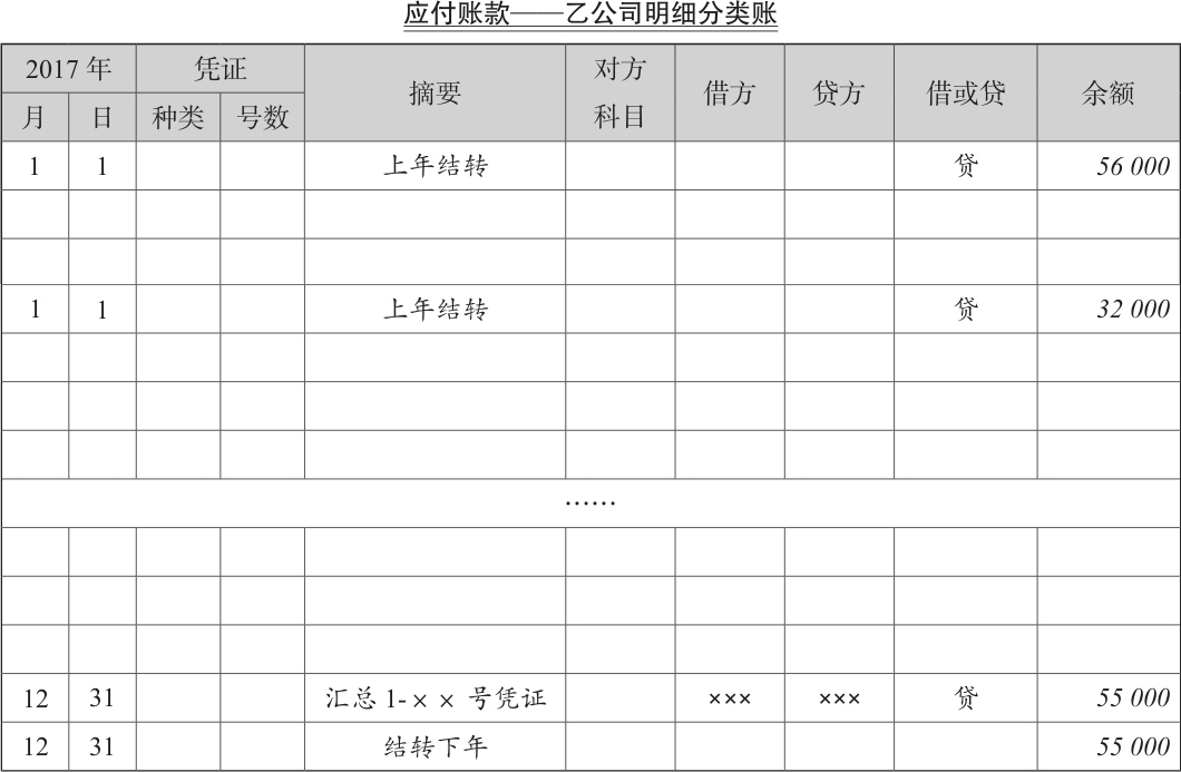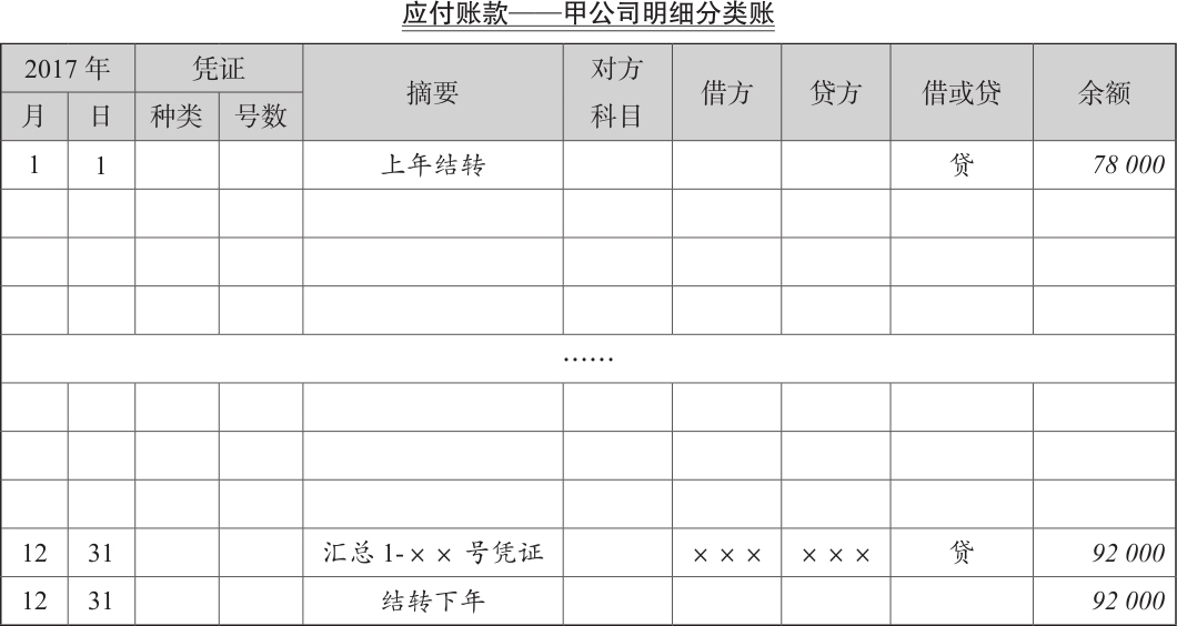 (1)“应付账款”贷方余额的明细分类账如表2-27和表2-28所示。