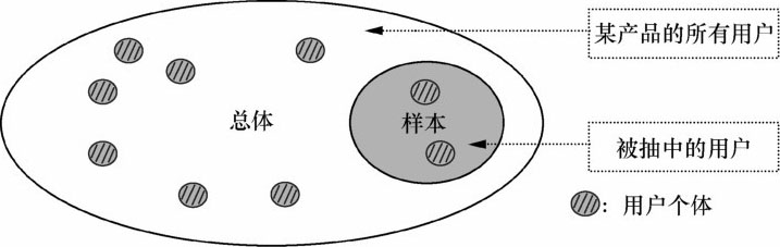 样本是从总体中抽取出来的一部分个体组成的整体。抽样的目的是用样本的数据特征推断总体的数据特征。例如,为了研究某产品用户的满意度,从该产品的全部用户中随机抽取5%构成样本,用这部分用户的满意度来估计该产品用户的满意度。总体、样本与个体的关系如图1-5所示。