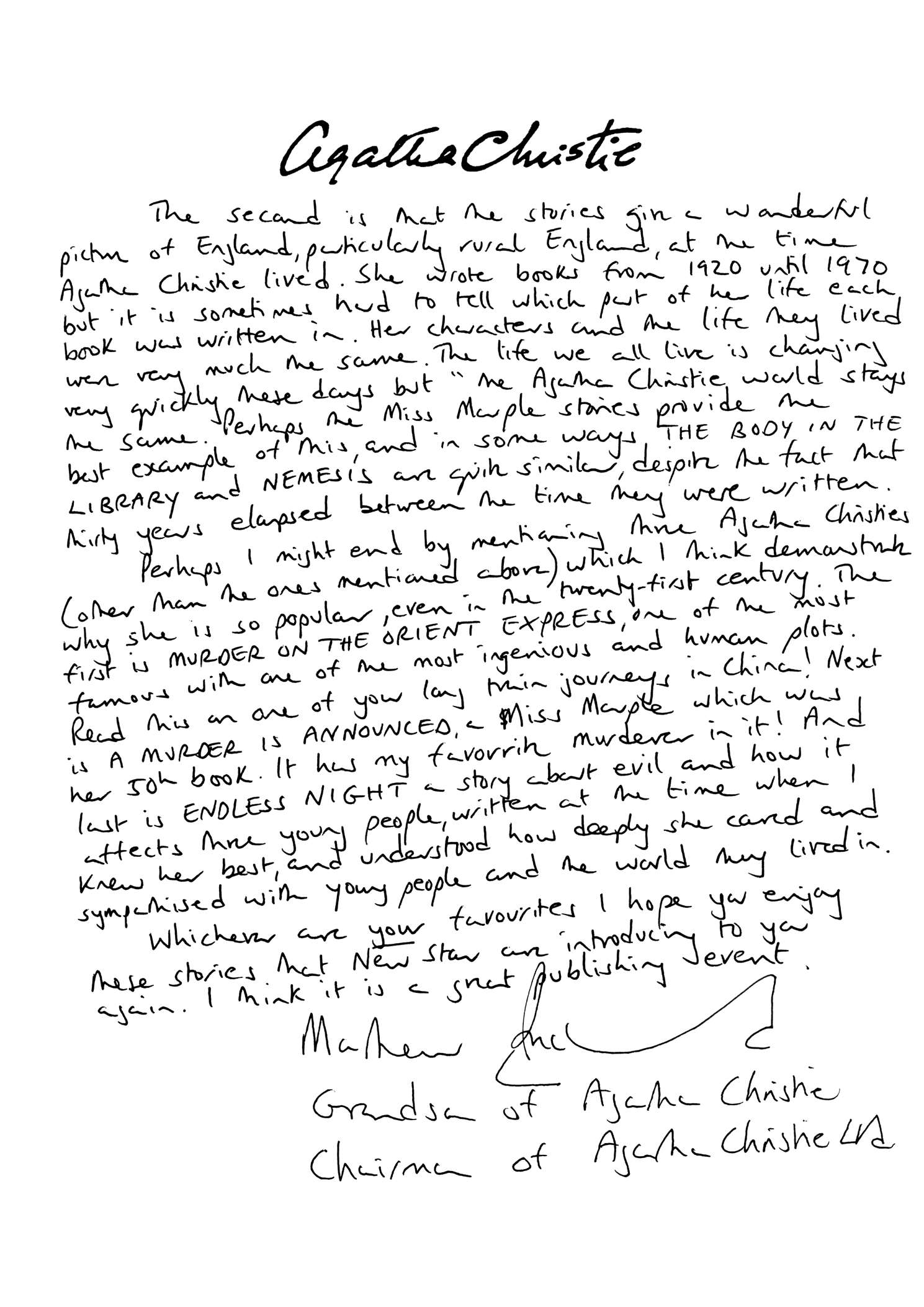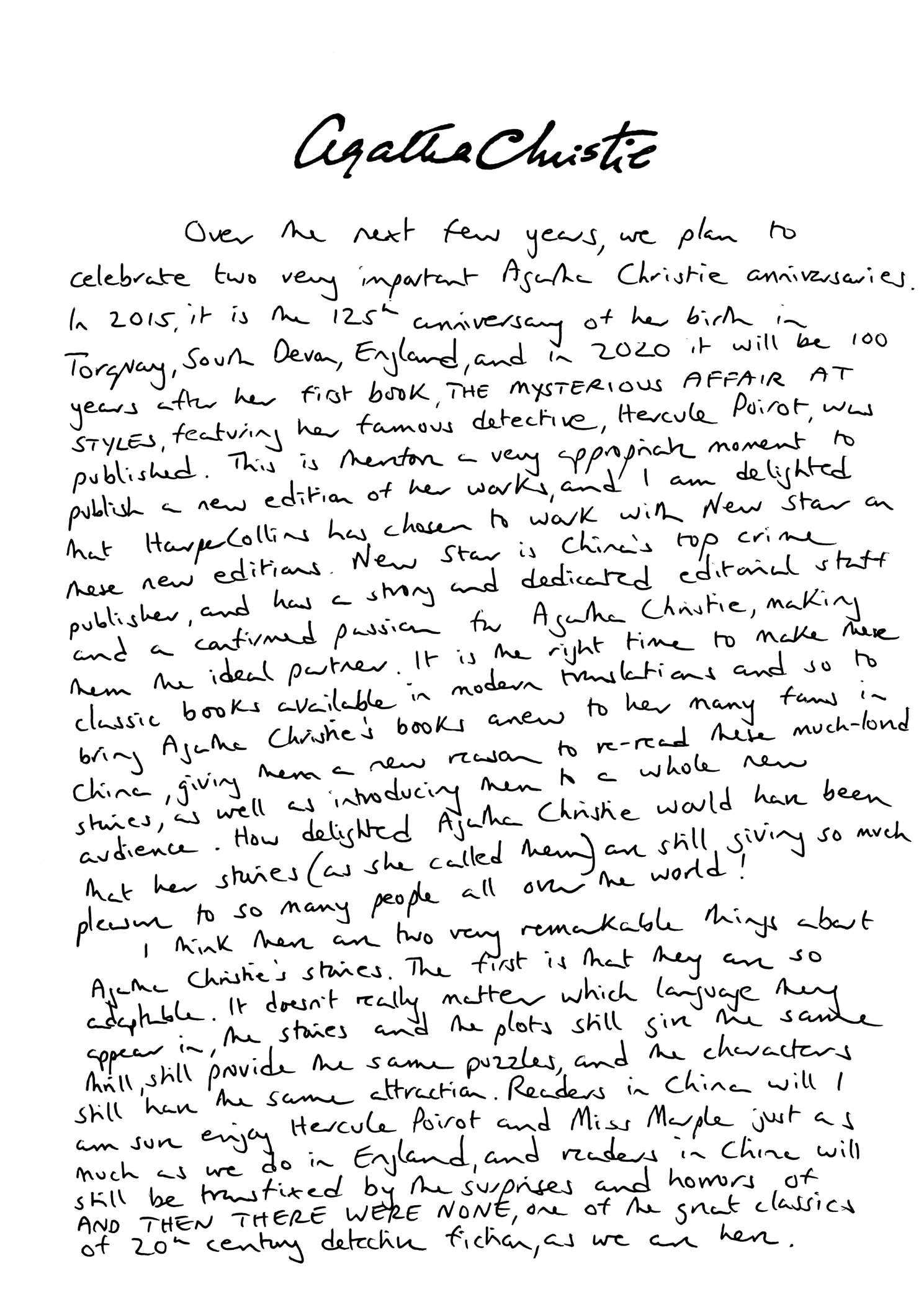 午夜文库成立之初就试图引进阿加莎的作品,但几次都与版权擦肩而过。随着午夜文库的专业化和影响力日益增强,阿加莎·克里斯蒂的版权继承人和哈珀柯林斯出版公司主动要求将版权独家授予新星出版社,并将阿加莎系列侦探小说并入午夜文库。这是对我们长期以来执着于侦探小说出版的褒奖,是对我们的信任与鼓励,更是一种压力和责任。