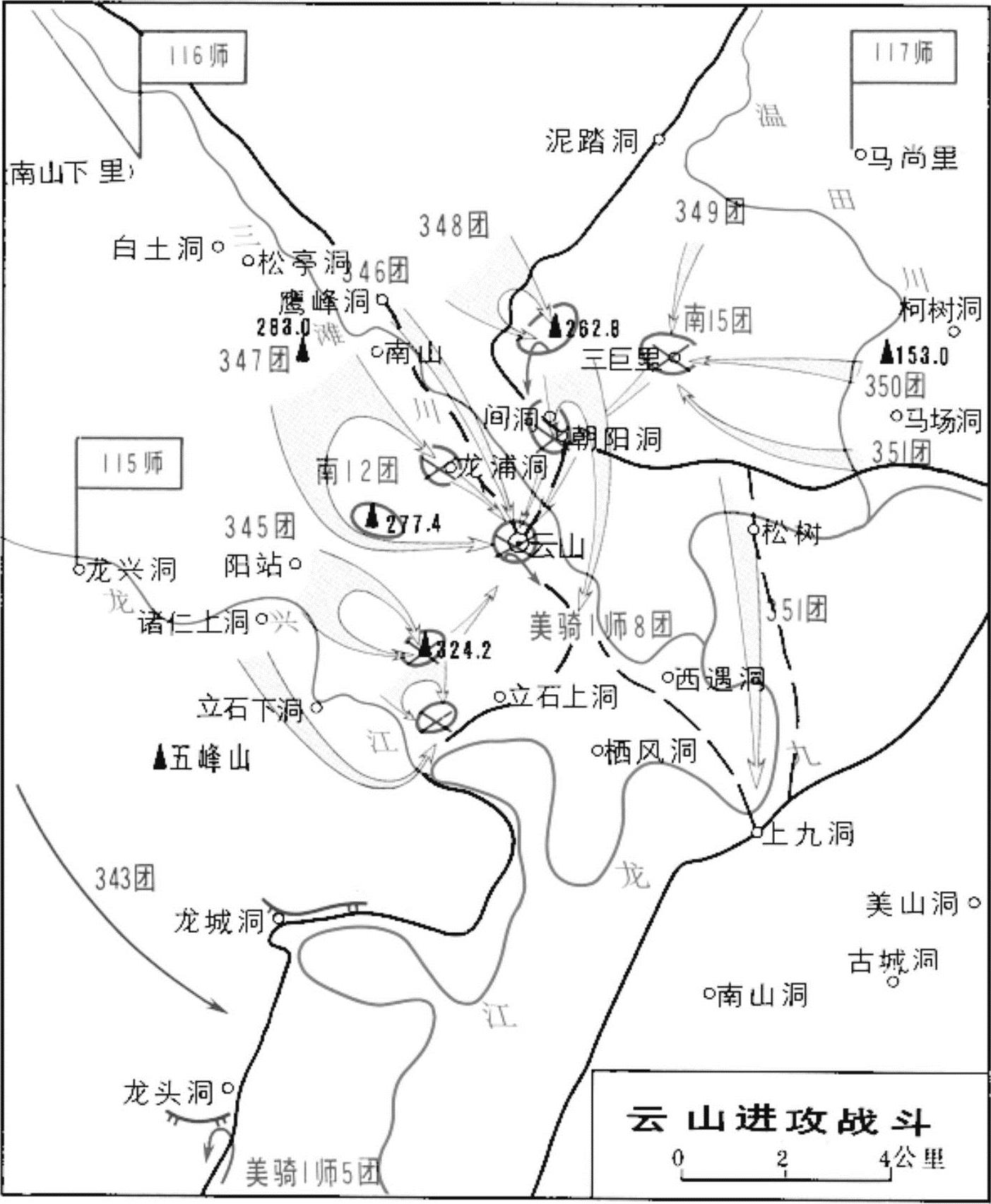 116师担任主攻,由西北方向沿三滩川两岸山麓经龙埔洞、262.8高地、间洞、朝阳洞向云山攻击前进,并以一部兵力向上九洞方向发展进攻;