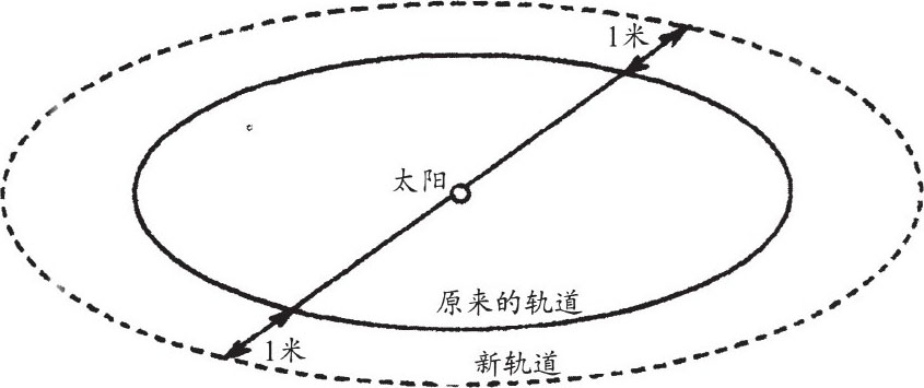 地球围绕太阳公转时,距离太阳大约是1.5亿千米。现在,假设地球绕日公转的速度不变,而这个距离增加1米,如图-23所示,那么,公转的全长会增加多少?一年又会增加多少天?