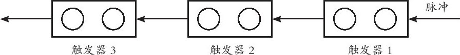 假设现在有很多个这样的触发器,给第一个触发器输入脉冲信号后,把它输出的回答脉冲加到第二个触发器上,第二个触发器的回答脉冲再加到第三个触发器上,以此类推。如图2所示,把它们顺次连接起来。现在,我们来看看这些触发器会如何工作。
