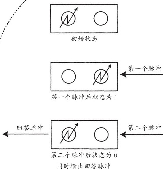 有一种电子装置叫做触发器,主要由两个电子管组成,就跟收音机里的电子管差不多。通过触发器的电流必定会通过其中的一个电子管,可能是左边的,也可能是右边的。触发器里有两个接触点,用来输出触发器的回答脉冲。在外面输入脉冲的瞬间,触发器就会立刻进行“翻转”,此时,原来导通的电子管变成闭合状态,电流转而进入另一个电子管。当右边电子管闭合、左边电子管导通的时候,触发器就会瞬间输出回答脉冲。