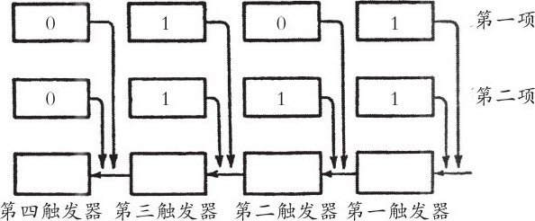 如图3所示,把3排触发器按照图中的样子连起来。第一排触发器用来记被加数,第二排用来记加数,最后一排记前两排加起来的和。当上面两排触发器的状态为“1”时,会向第三排的触发器输出脉冲信号。
