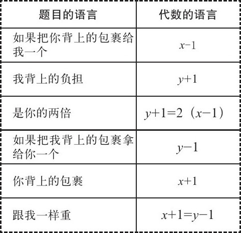 【解答】我们先来把普通的语言转换成代数的语言,见下表。