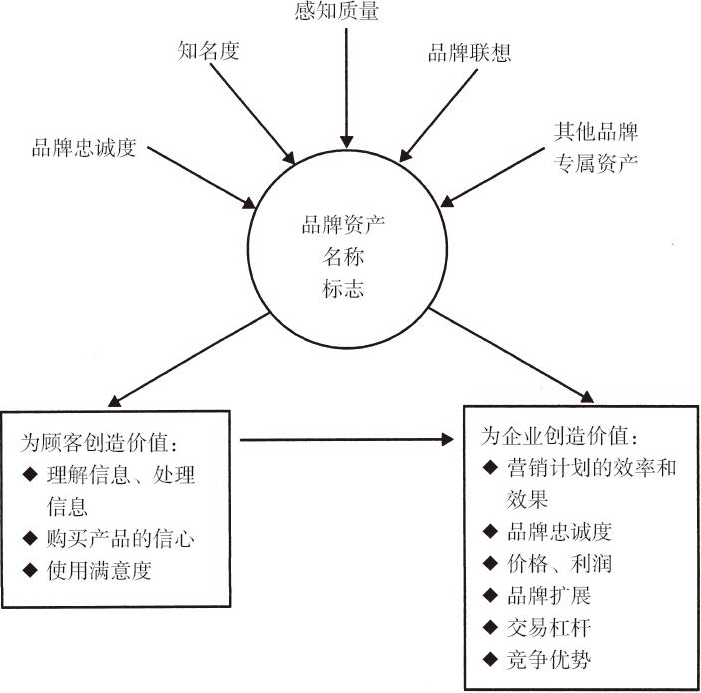 图1-1为品牌资产概念的总结。从图中可以看出,这五类资产是品牌资产的基本维度。另外,从图中还可以看出,品牌资产为顾客和企业都创造了价值。