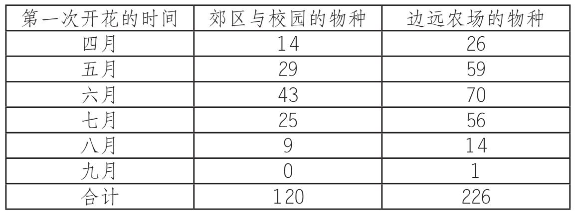 可以推断,附近农场的富庶程度是与其植物群的匮乏程度成比例的。我自己选择了这个农场,因为它不够富庶,没有公路经过。实际上,我所在的整个地区都位于与进步长河逆向而成的反流。我的农场道路是过去拓荒者的马车道,路面从未做过坡度减缓,也不曾铺上碎石,没人清扫,也没见过推土机。我的邻居们让郡事务官感叹。他们篱笆下的地垄已经连续好几年没有耕种过了,他们的沼泽没有筑堤,也没排过水。因为在去钓鱼和去进步之间,他们倾向于选择去钓鱼。于是,在周末,我与植物一起生活的标准,是那种边远林区的标准,而在非周末时,我则尽可能依靠大学农场、大学校园和邻近郊区的植物。十年来,出于消遣,我记录了这两个不同区域里野生植物初次开花的时间: