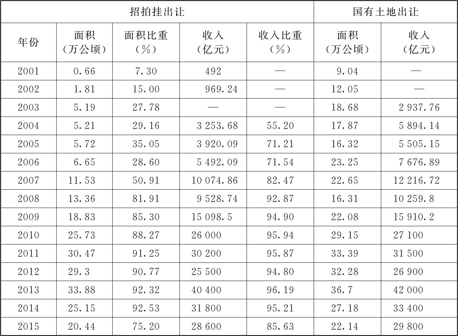 全国招拍挂出让土地的面积和价款从2001年的0.66万公顷、492亿元,提高到2006年的6.65万公顷、5 492.09亿元。2004年国务院发布28号文件规定工业用地必须实行招拍挂,国有建设用地招拍挂出让比重逐年上升,2001—2010年,招拍挂出让面积占出让土地面积的比重从7.3%提高到88.27%。土地招拍挂出让收入占出让总收入的比重到2010年达到95.94%(见表1- 1)。