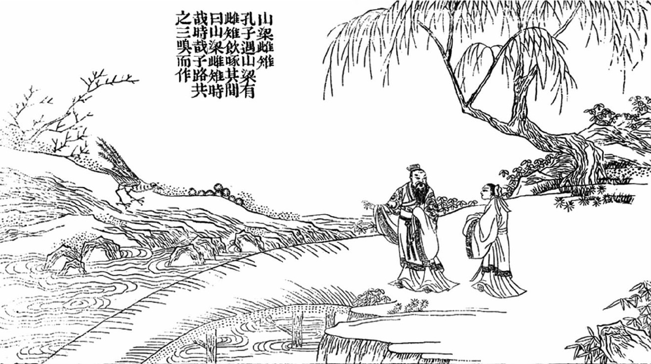 孔子与子路继续向前,又靠近了这几只野鸡。子路听了孔子的话,不知是否明白了老师的意思,遂不无俏皮地向野鸡拱拱手,好像为自己打扰了它们表示歉意。野鸡们犹豫了一会,便振翅飞去了。