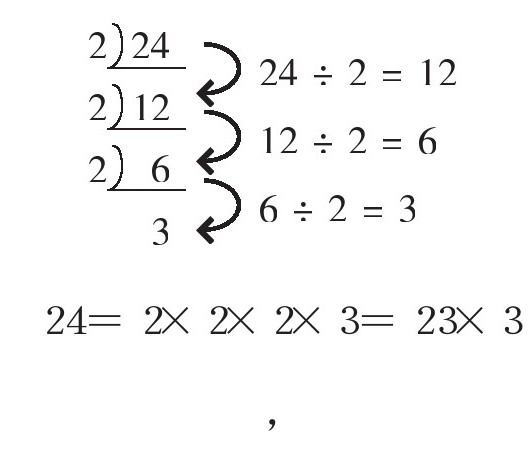 如此一来,我们就完成了24的分解质因数过程。也就是说,24可分解为3个“2”和1个“3”。