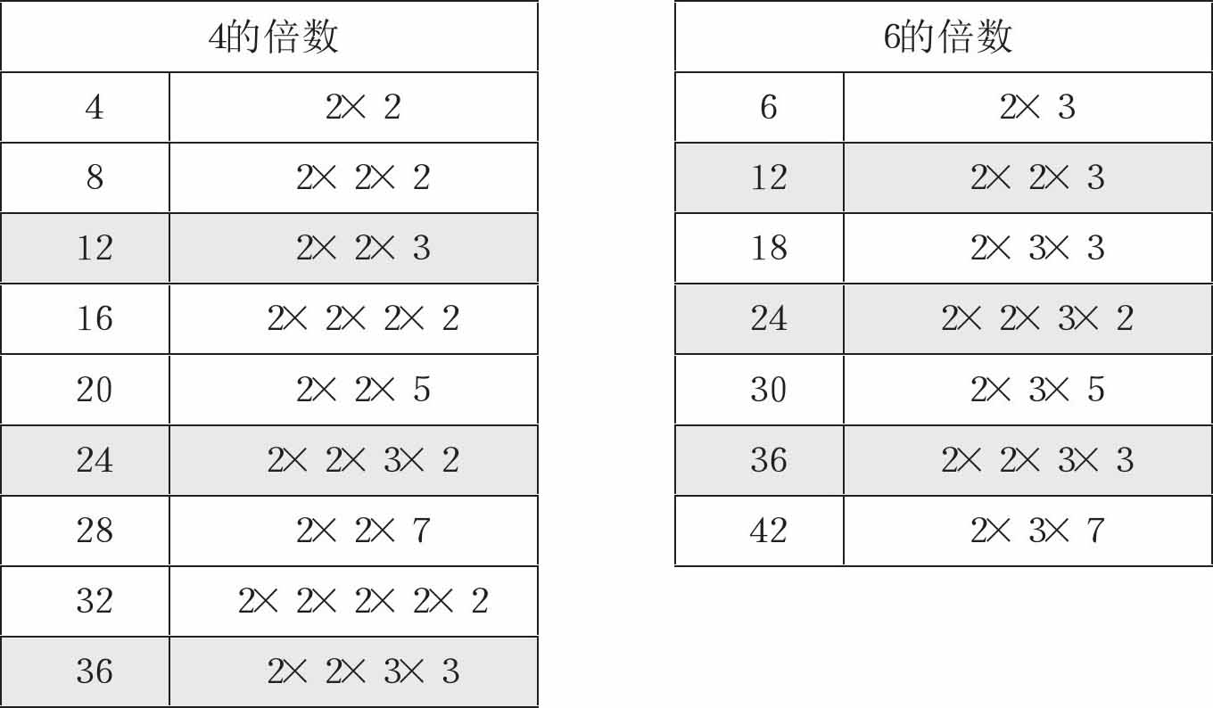通过分解质因数来思考4和6的倍数,可用表格进行归纳,我们会发现“2×2×3”及其倍数是共有的。