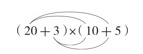 综上所述,在十进制中,23×15的意思是:用23(=10×2+1×3=20+3)与15(=10×1+1×5=10+5)相乘,可先将23×15分解为(20+3)×(10+5),再用我们在后面会学到的乘法分配律进行计算,