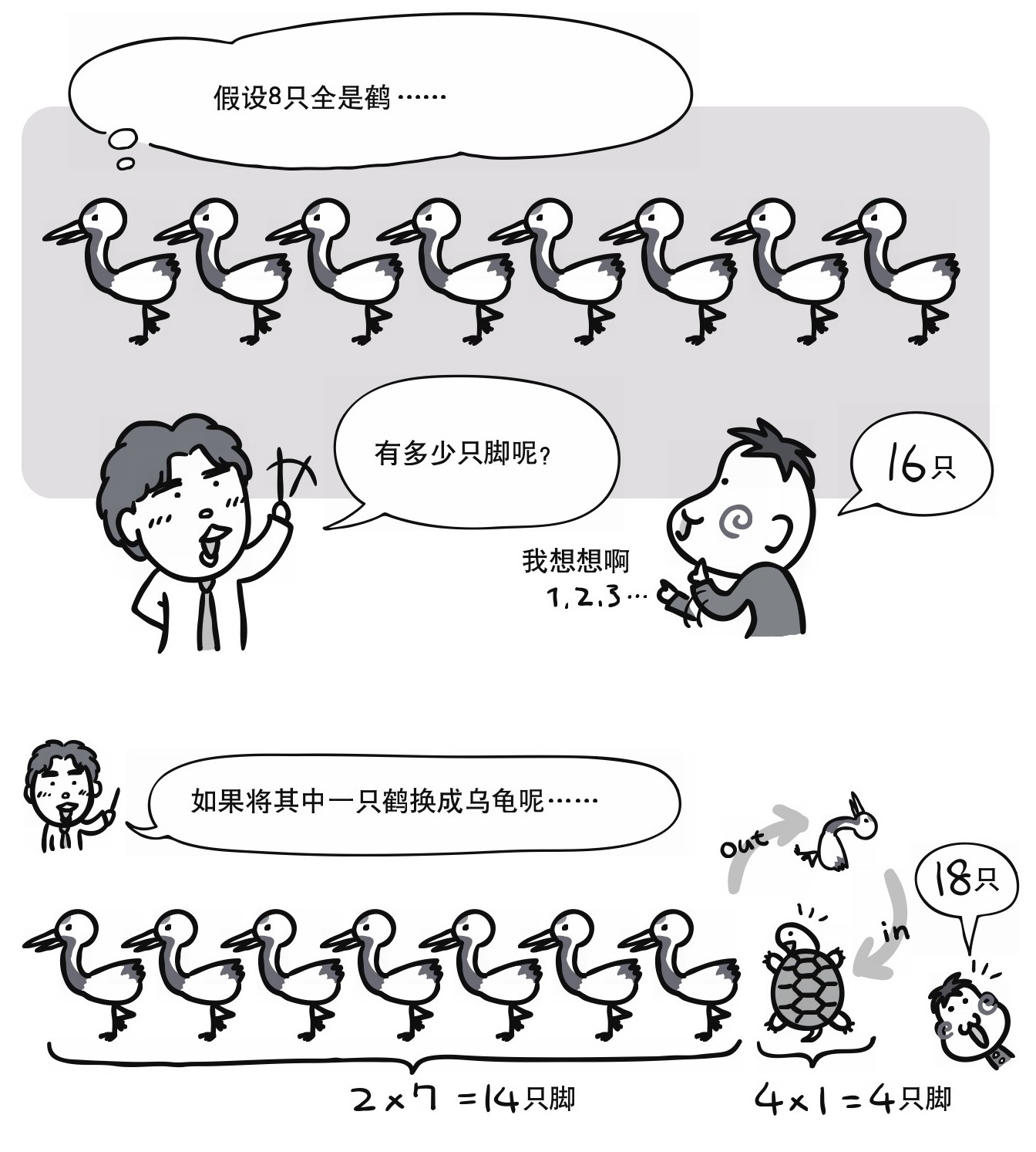 顺便说一句,我当初读的是小初高一体化的学校,并没有学过龟鹤算,因为这种需要使用特殊算法解开的问题,都能通过初中数学中的方程来解答(具体内容我会在第3章“合理解题”中进行讲解)。